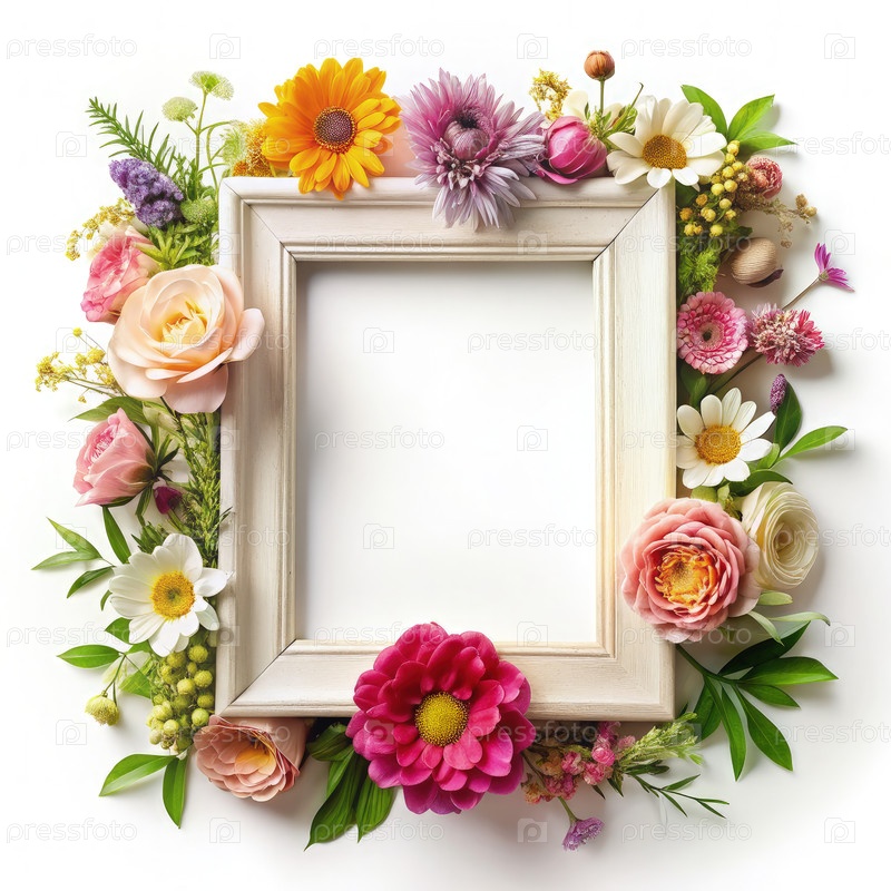 Белая рама, окруженная красочными цветами на белом фоне