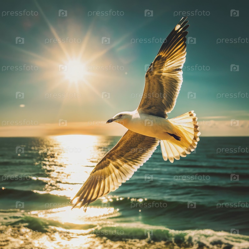 Медведь, летящий сквозь золотистый закат над океаническими волнами