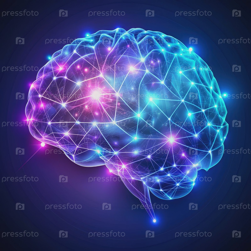 Абстрактный человеческий мозг с сияющими синими и фиолетовыми нейронами