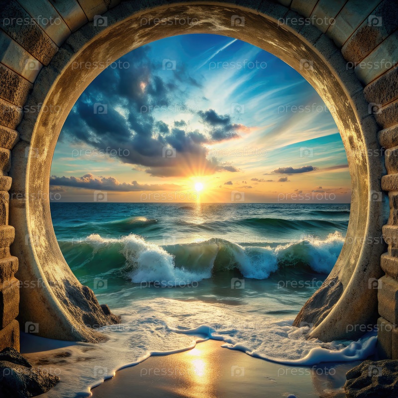 Вид на закат через круглую каменную арку