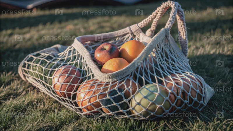 Торба из сетки, заполненная фруктами, отдыхающими на зеленой траве