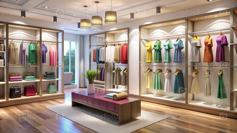 Женский магазин одежды Интерьерный дизайн с полками и платьями. генеративная современная ИИ