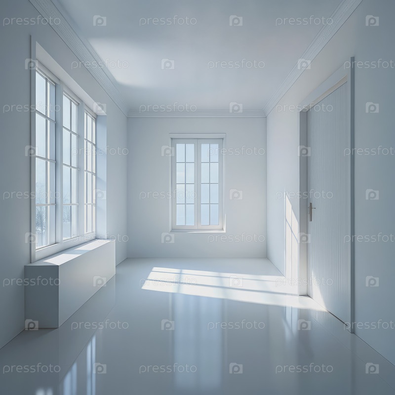 Яркая пустая комната с двумя окнами и дверью
