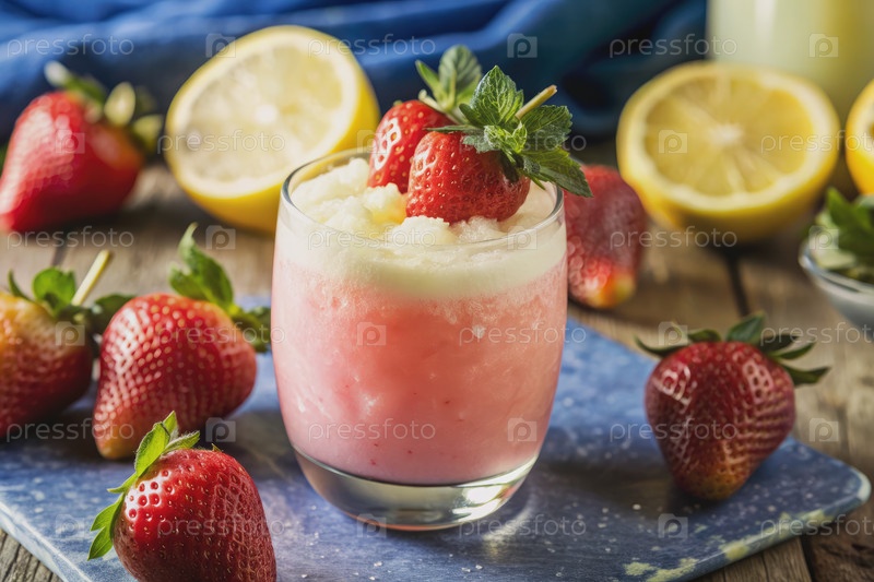 Boozy Frozen Strawberry Lemonade With Fresh Mint Garnish on Wooden Table (Бьюзи замороженный клубниковый лимонад с свежей мятой на деревянном столе)