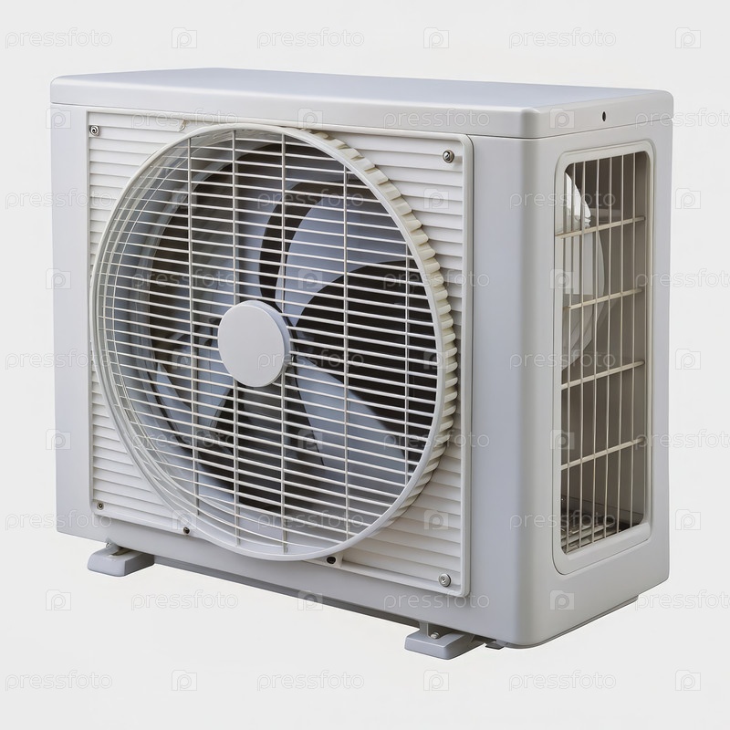 Белый кондиционер с вентилятором и грилем, изолированный на белом фоне