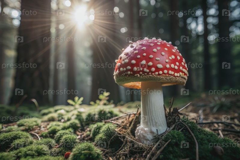 Однолетний сельскохозяйственный гриб растет в лесном солнечном свете. генератив AI