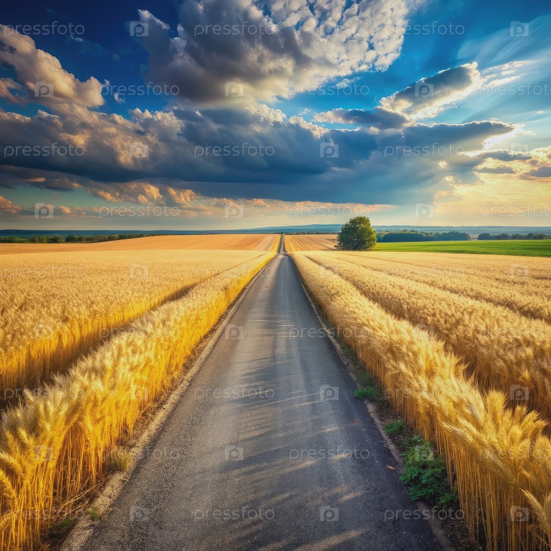 Асфальтированная дорога через поля золотой пшеницы на закате