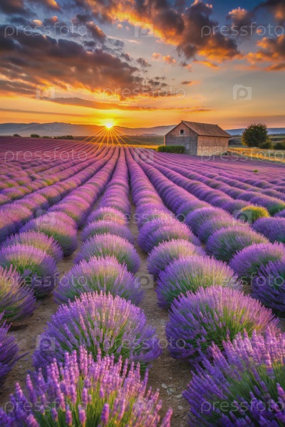 Поля лаванды на закате с деревенской фермой. генеративная ИИ