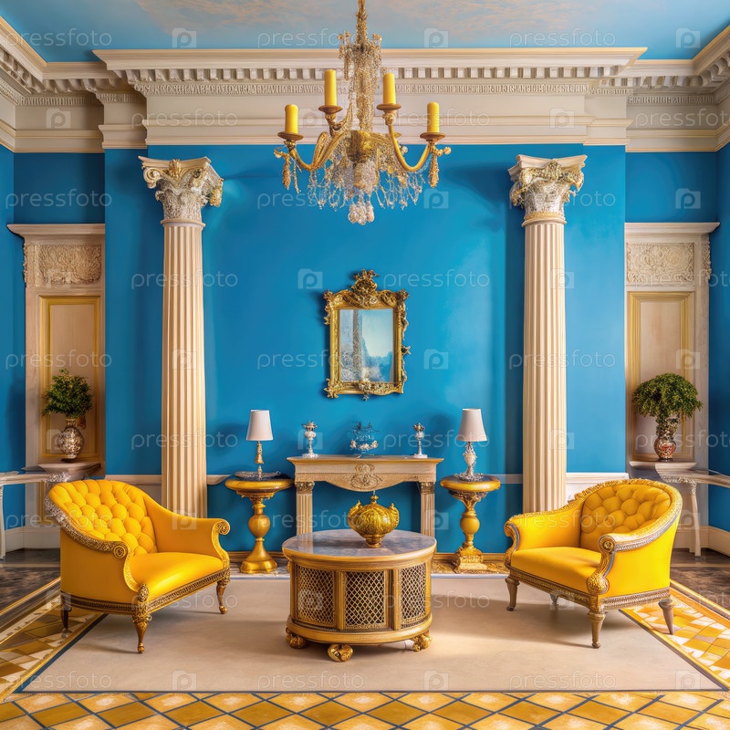 Неоклассическая гостиная с синими стенами, золотыми акцентами и двумя желтыми креслами