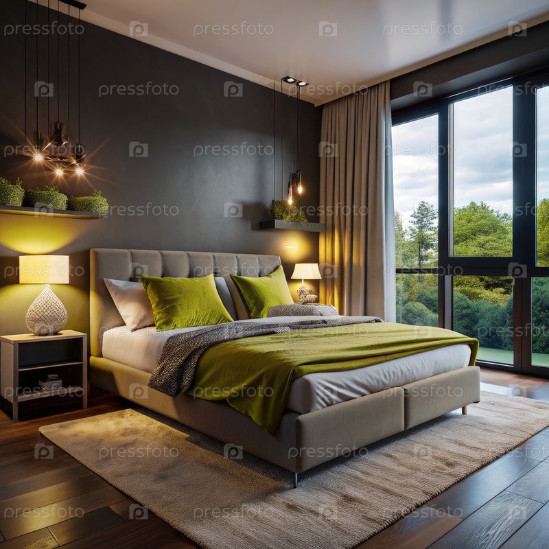 Спальня с зелеными акцентами и вечерним светом. генеративный современный ИИ