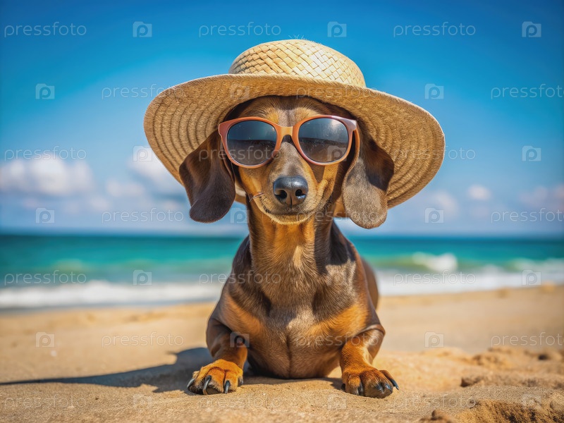 Дахшунд с солнечными очками и соломенной шляпой на пляже