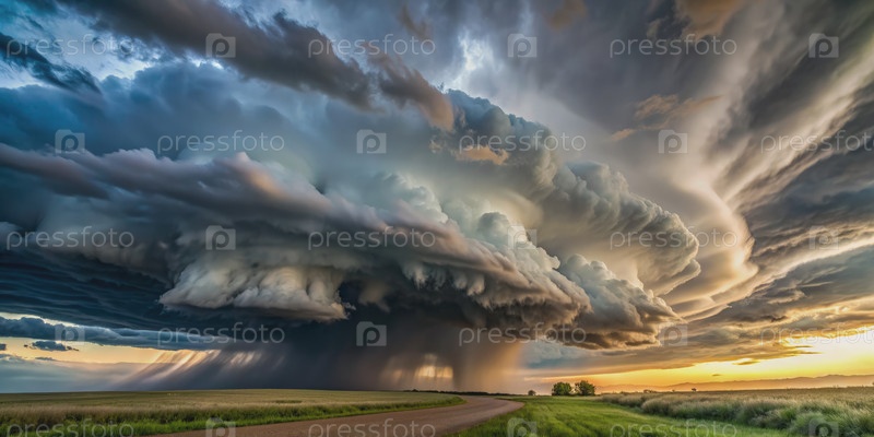 Драматические штормовые облака над сельским ландшафтом на закате