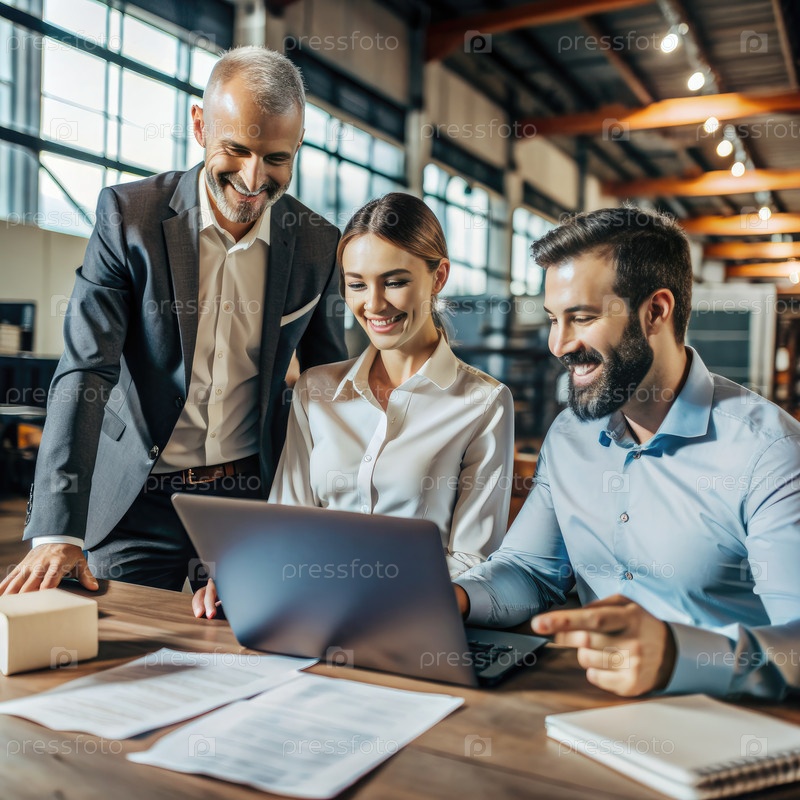 Три бизнес-профессионала сотрудничают на ноутбуке в современном офисе