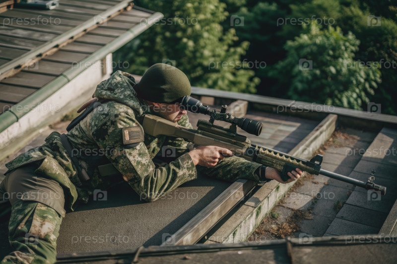 Камуфлированный снайпер, лежащий в ожидании на крыше с оптической винтовкой