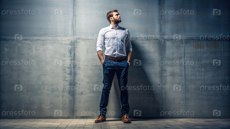 Мужчина в белой рубашке и джинсах стоит на бетонной стене