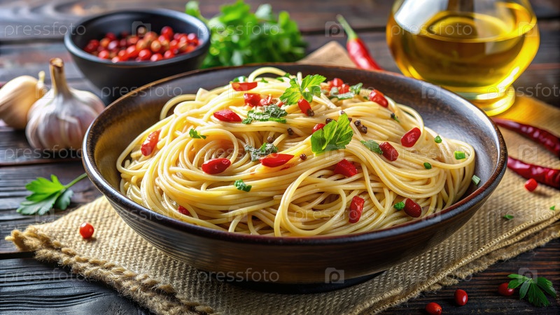 Вибрирующая тарелка спагетти Aglio E Olio с красными хлопьями чили и свежими травами