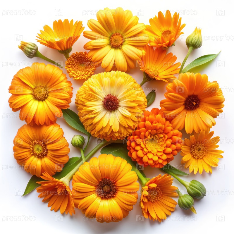 Главный вид ярко-оранжевых цветов календулы, расположенных в кругу на белом фоне