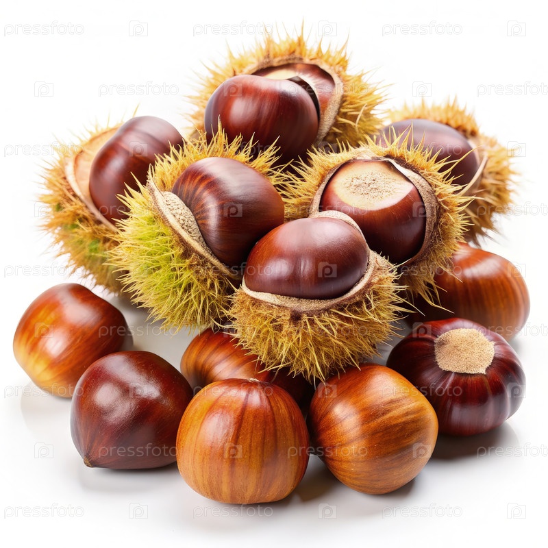 Куча свежесобранных каштанов на белом фоне