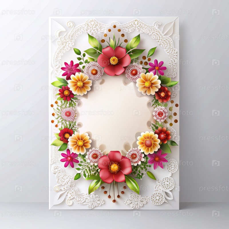 Белая карточка с круглым цветочным венком из красных, желтых, розовых и белых цветов