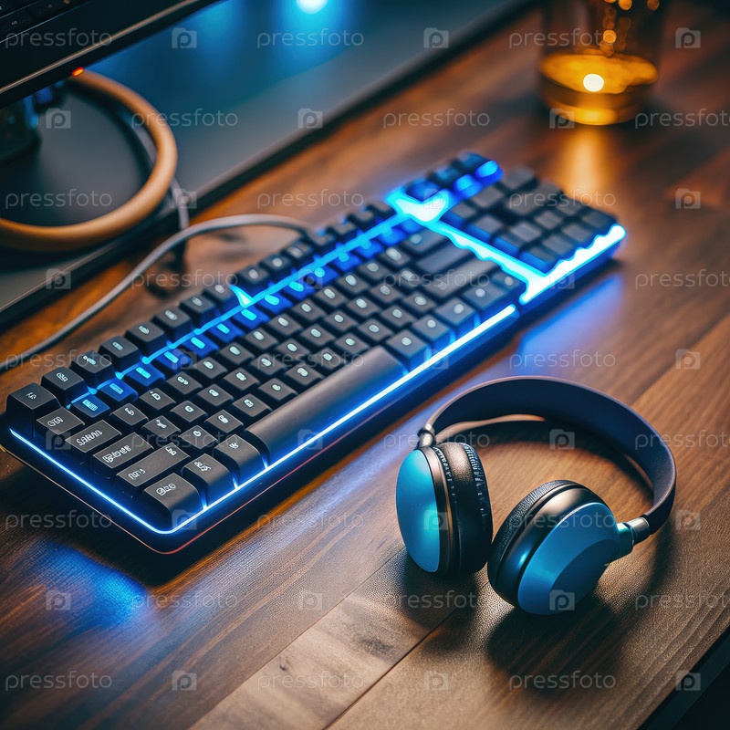 Освещенная клавиатура и наушники на деревянном столе. генеративный ИИ