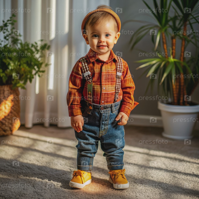 Маленький мальчик в платной рубашке и подвесках стоит на ковровом полу