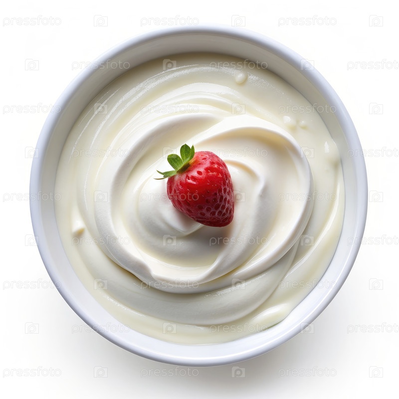 Вид сверху белой чаши, наполненной сливочным йогуртом и покрытой одной клубникой