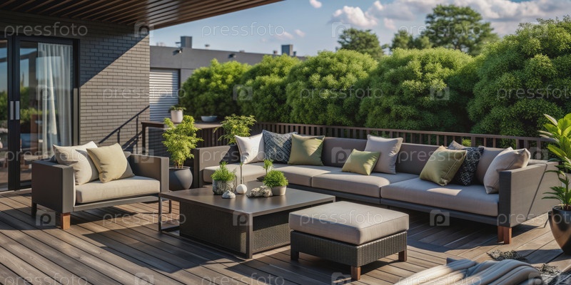 Набор мебели на крыше террасы с стульями и кофейным столом. генерирующий шикарный AI