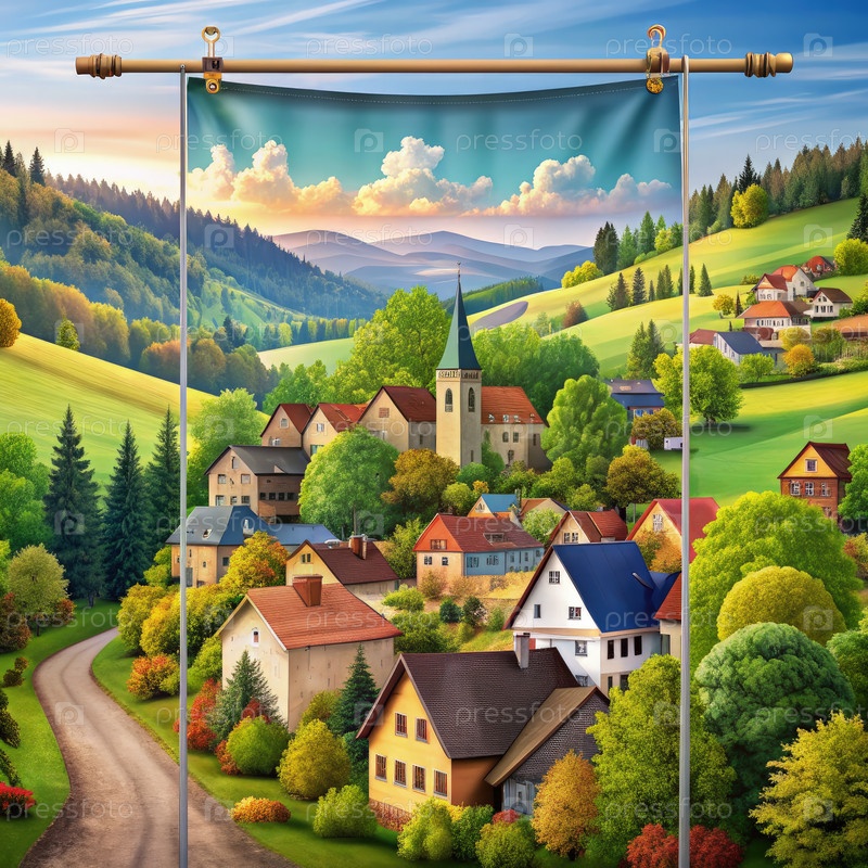 Красочный баннер деревни отображается на зеленом холмистом ландшафте