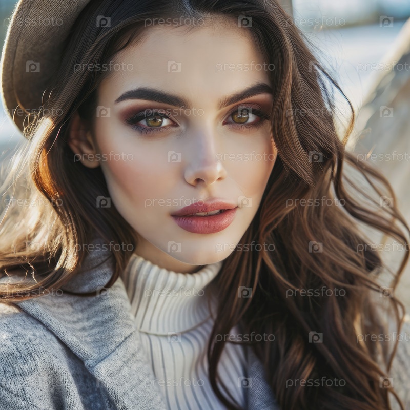 Брюнетка в коричневой шляпе и белом свитере позирует на открытом воздухе