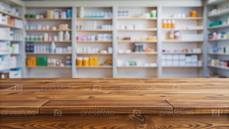 Пустой деревянный стол в размытом интерьере аптеки. генератив AI