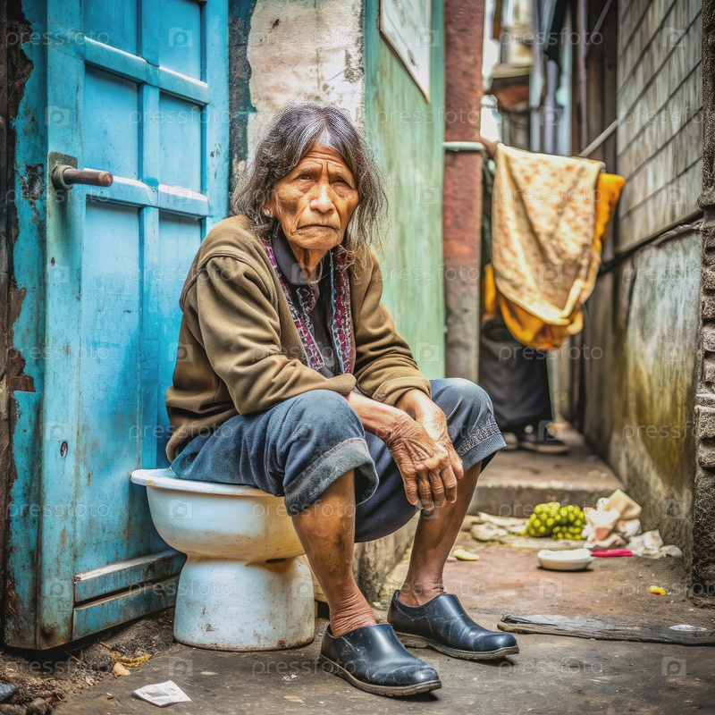 Пожилая женщина сидит на туалете в узкой аллее