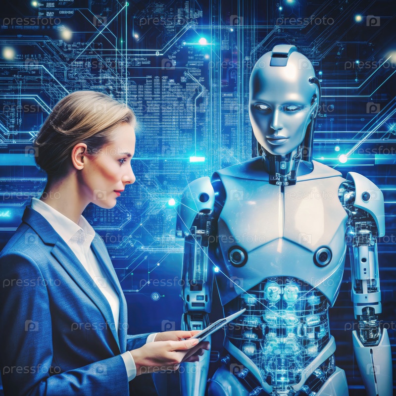 Деловая женщина взаимодействует с продвинутым роботом ИИ в футуристической обстановке