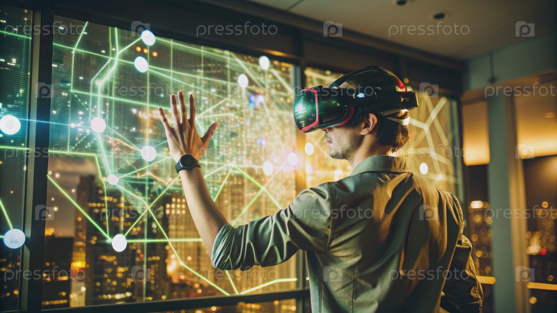 Хакер, носящий гарнитуру VR Гарнитура взаимодействует с цифровой картой сети в темной комнате ночью
