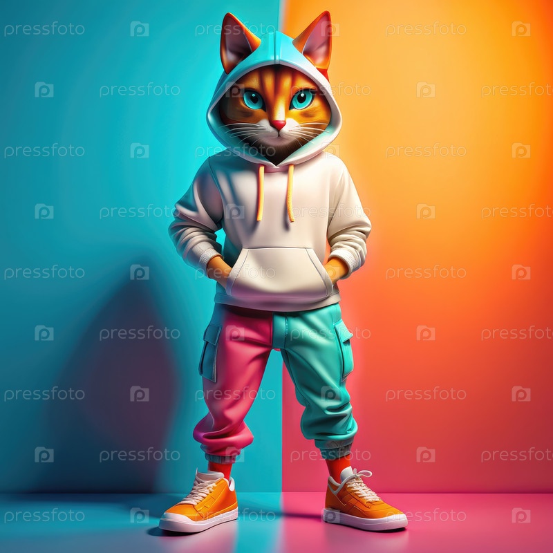 Анимационный персонаж кота, носящий капюшон и красочные брюки на синем и оранжевом фоне