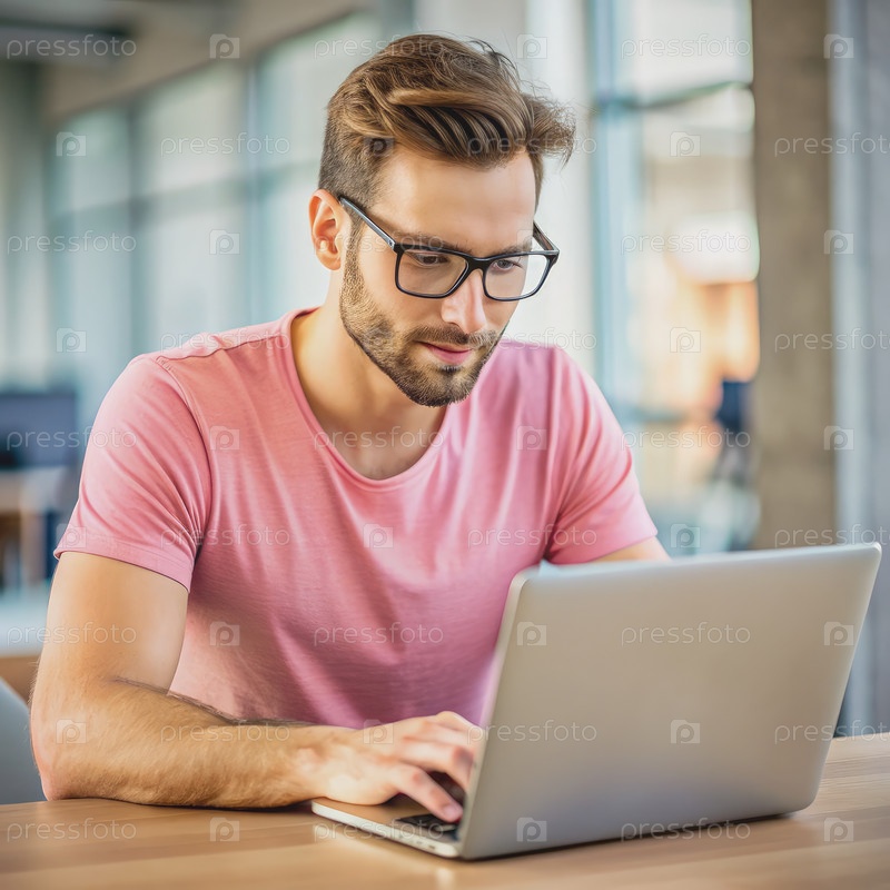 Молодой человек с светло-коричневыми волосами работает на ноутбуке в офисе