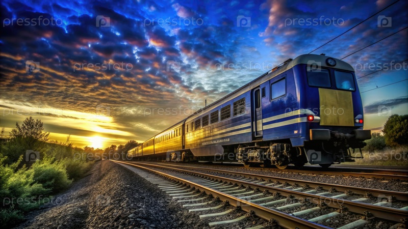 Синий поезд путешествует по ландшафту захода солнца. генеративный ИИ
