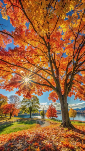 Солнечный осенний пейзаж с яркой лиственницей и отражениями озера