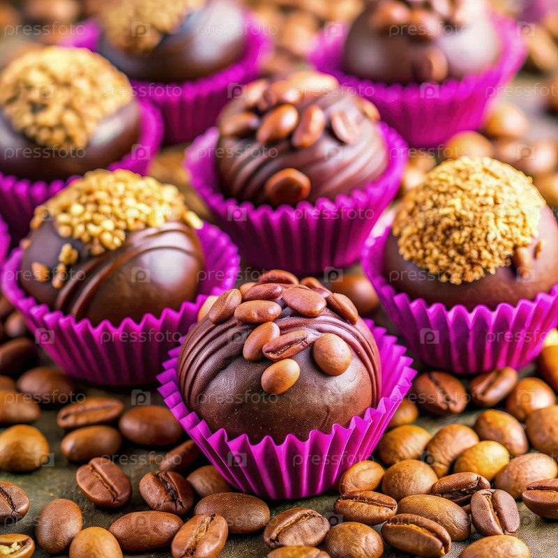 Шоколадные трюфели, украшенные кофейными зернами и семенами кунжута в розовых бумажных чашках
