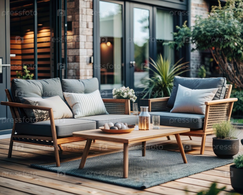 Набор мебели для наружного двора с серыми подушками и деревянной рамой. генеративный современный AI