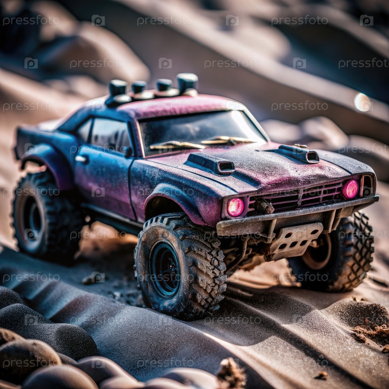 Темно-синий и фуксия игрушечный автомобиль, ориентирующийся по песчаной дюне. генеративный ИИ