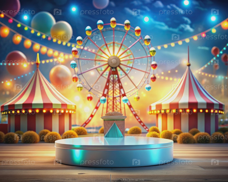Пустой подиум на праздничном карнавале с колесом обозрения и палатками