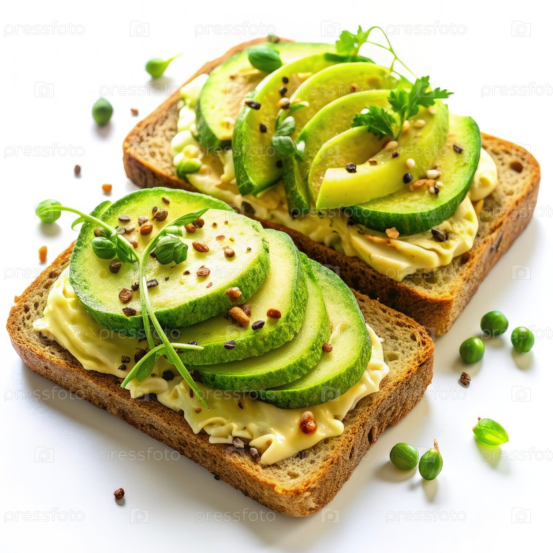 Два куска тоста из авокадо с побегами и семенами на белом фоне