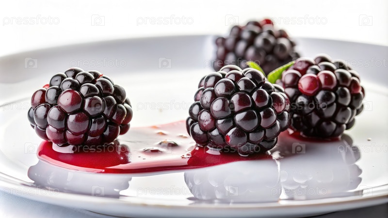 Ближайшее изображение черники на белой тарелке с красным соусом. генеративный ИИ