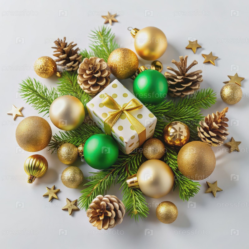 Рождественские украшения с сосновыми ветвями, подарками и орнаментами