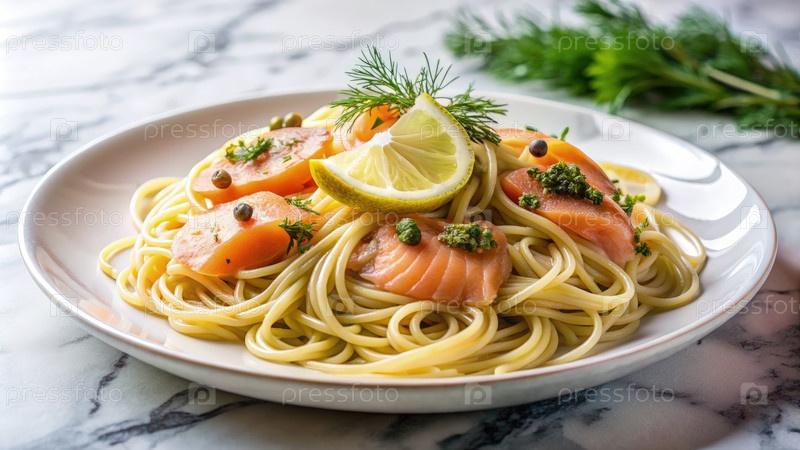 Гурманский куриный лосось спагетти с лимоном и укропом. генеративная ИИ