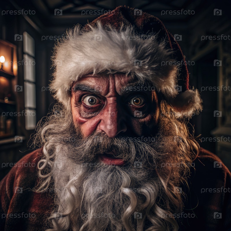 Злой Санта-Клаус с широкими глазами смотрит на камеру в темной комнате