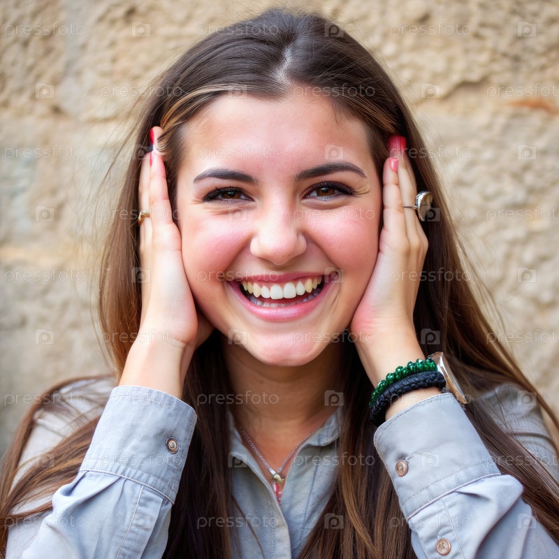 Молодая женщина улыбается и закрывает уши на каменную стену