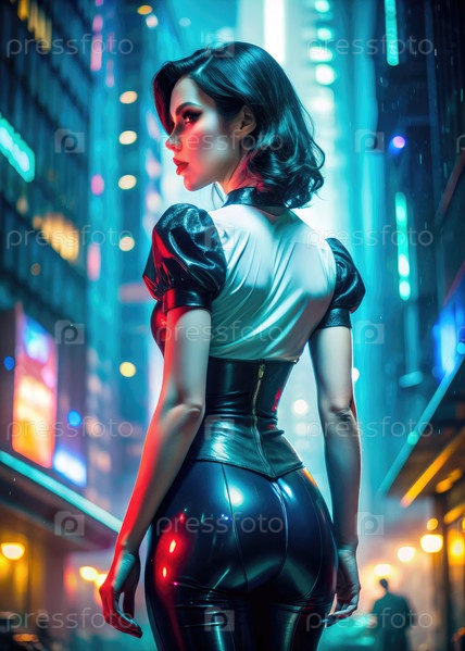 Киберпанк-женщина в кожаных брюках, стоящая ночью на улице города с неоновым освещением