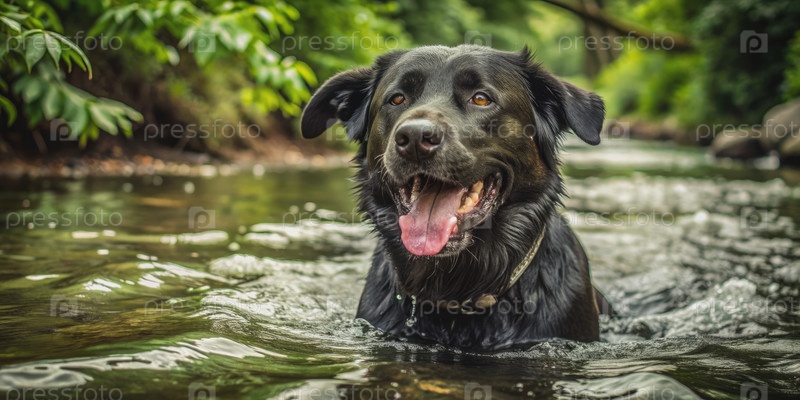 Счастливая черная собака наслаждается прохладным купанием в летнем ручье