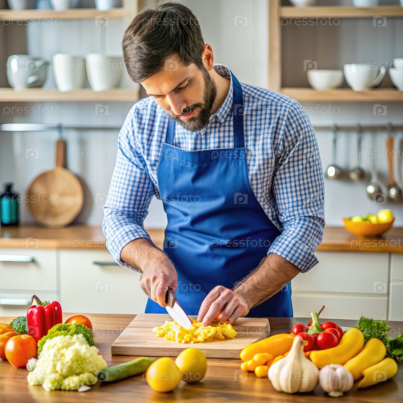 Человек, нарезающий овощи на кухне и носящий фартук